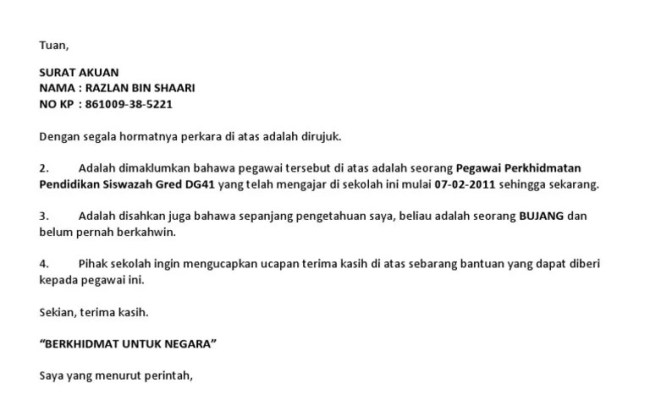 Surat akuan bujang ini hanya boleh diterima pakai sehingga selesai permohonan. Tuan, pengesahan akuan bujang perkara di atas adalah dirujuk.